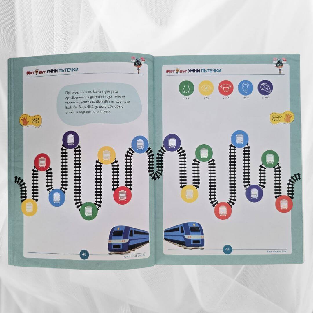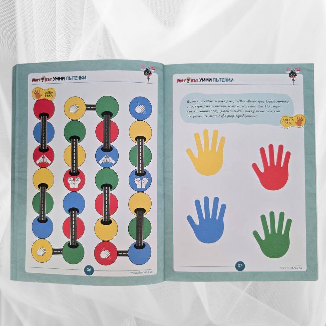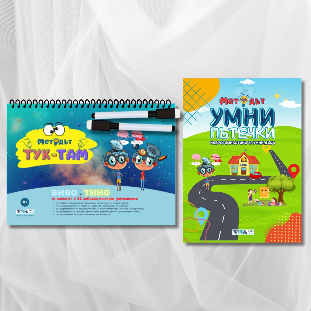 Иновативните сборници “Методът Тук-Там” и “Методът Умни Пътечки” помагат на деца над 4 годишна възраст да подобрят ЗНАЧИТЕЛНО паметта, вниманието, концентрацията и фината си моторика чрез неврогимнастики, без да стоят пред екрани, стимулирайки ги да пораснат като уверени, организирани и успешни хора.